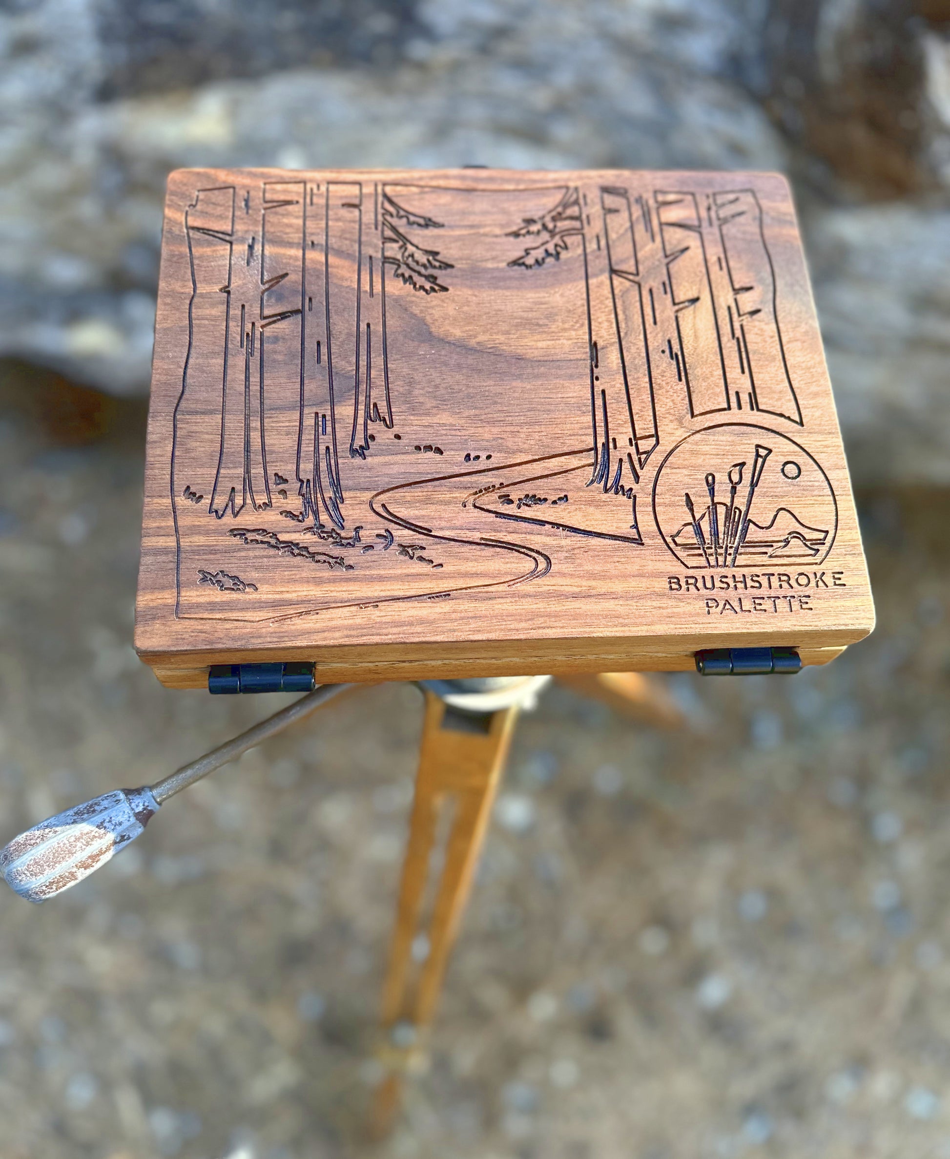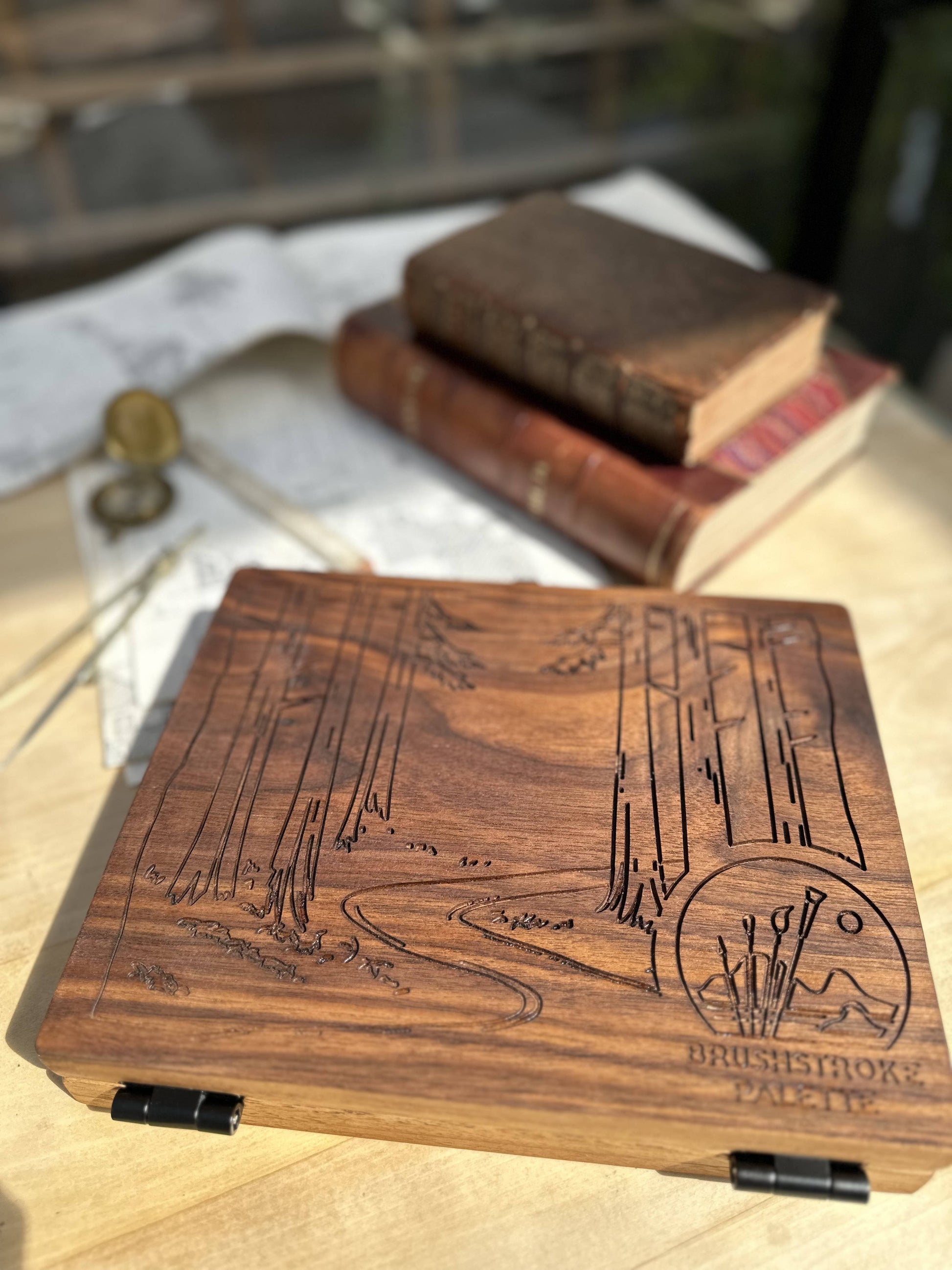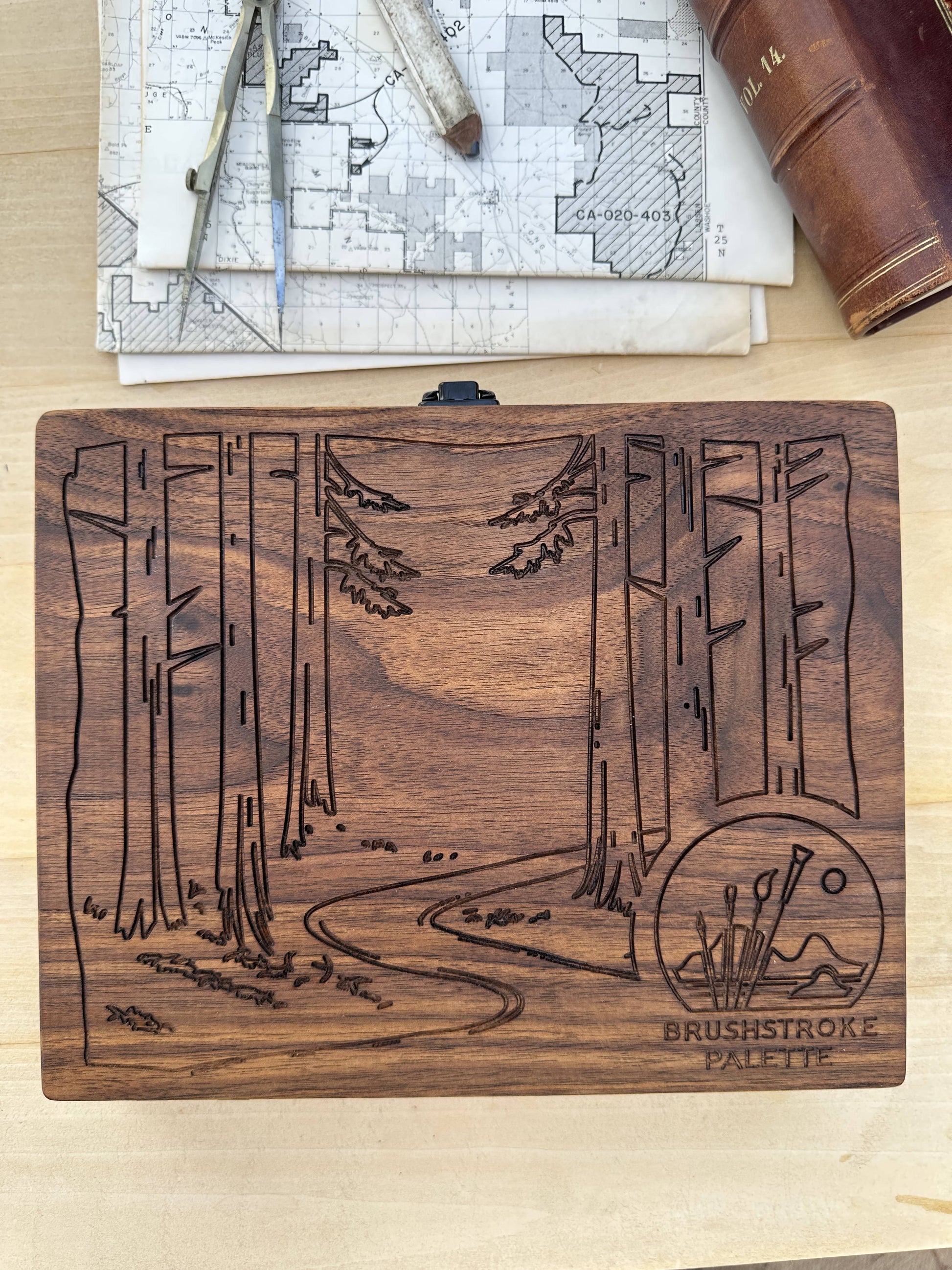 - One (1) walnut Brushstroke Palette with Forest scene etched on the lid.