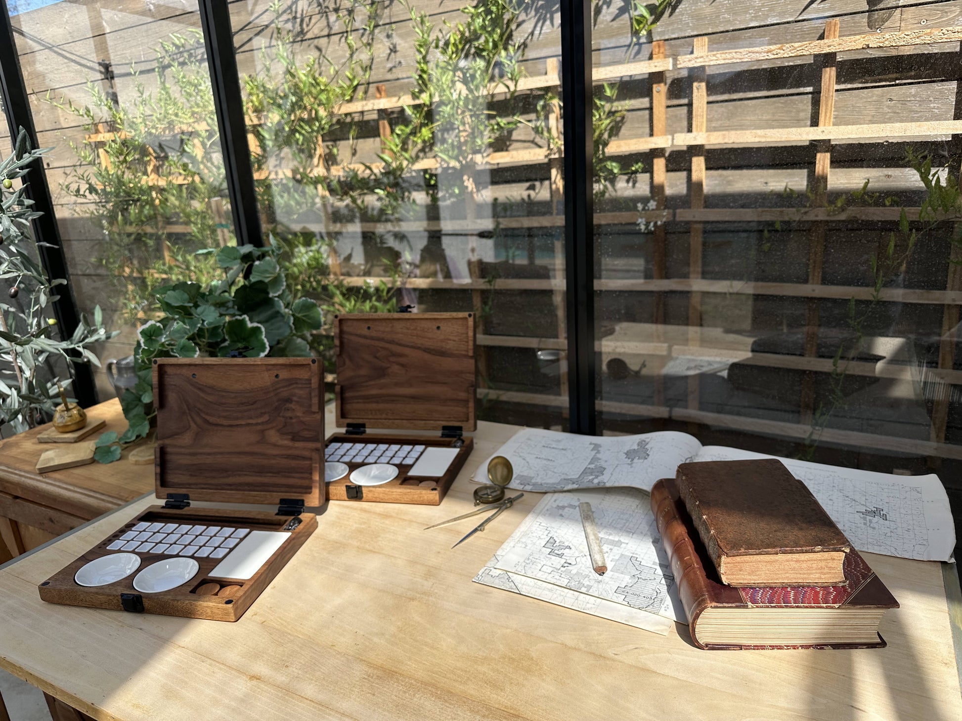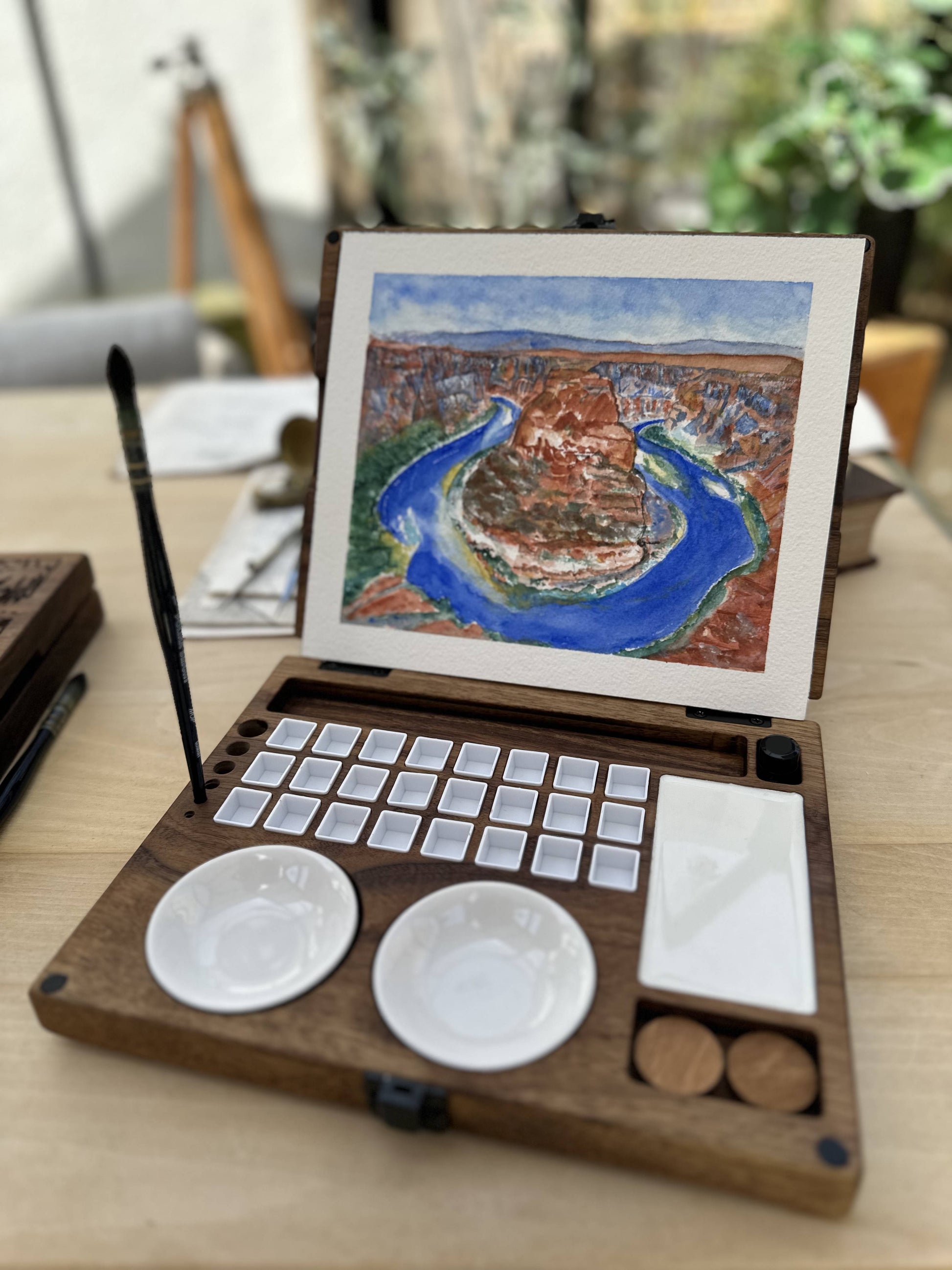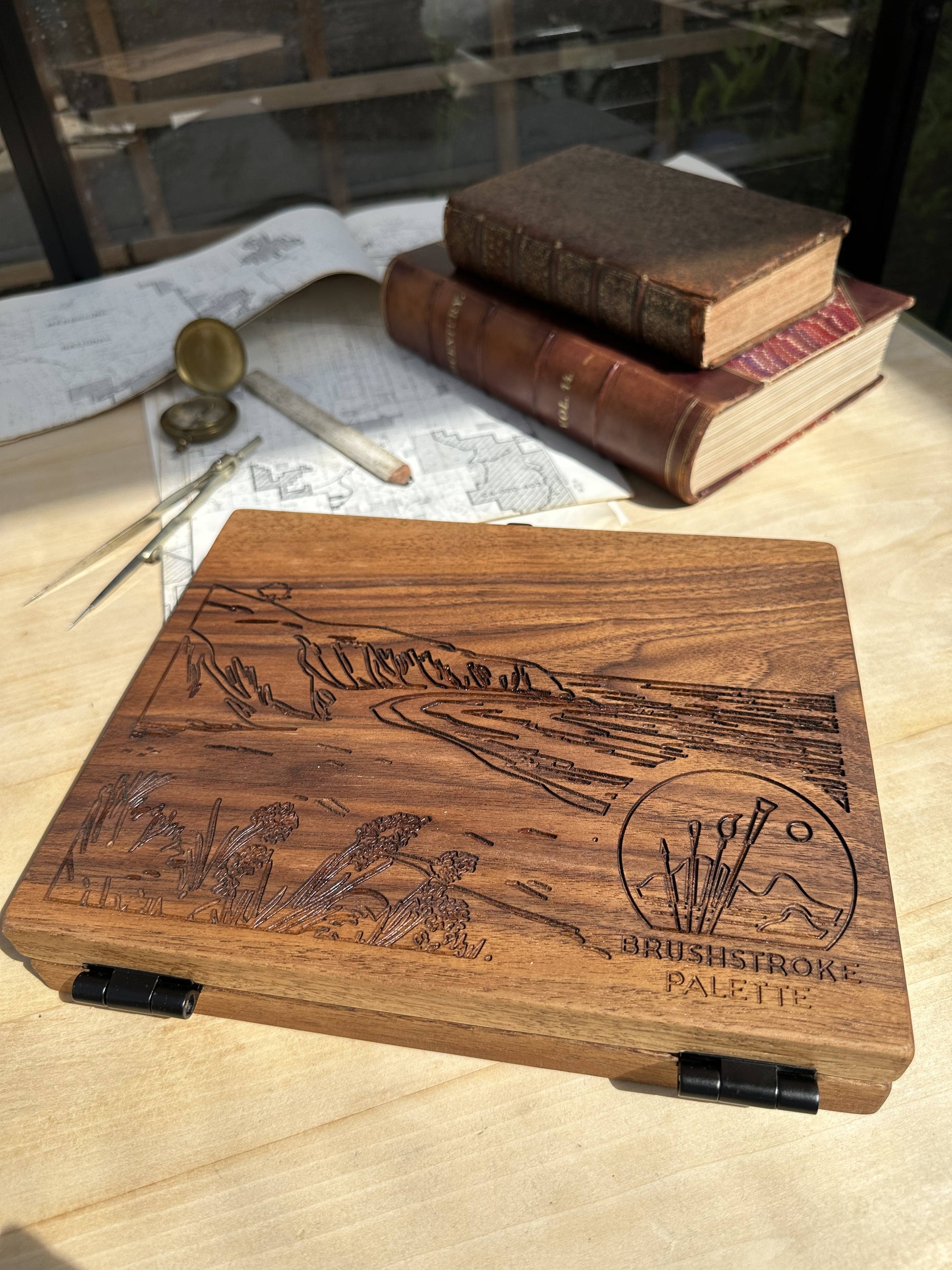 Our flagship design etched with a scene depicting the Pacific Coast, an original work, this beautiful handmade watercolor palette is carved from the highest quality American walnut hardwood and complete with every feature that a watercolor painter needs in the field. Handmade and assembled in our small Burbank, California workshop, this patent pending design was created with artists' needs at the front of our minds. Who are we? We are a small business with a deep passion for art, especially outdoor sketching and watercolor painting. Our goal? Help artists find inspiration in their natural environment and escape the indoors whenever possible, even if it's just a few inches outside the door. We've always thought that a fresh location is often the key to a fresh perspective, so try our palette and let us know if we're right.